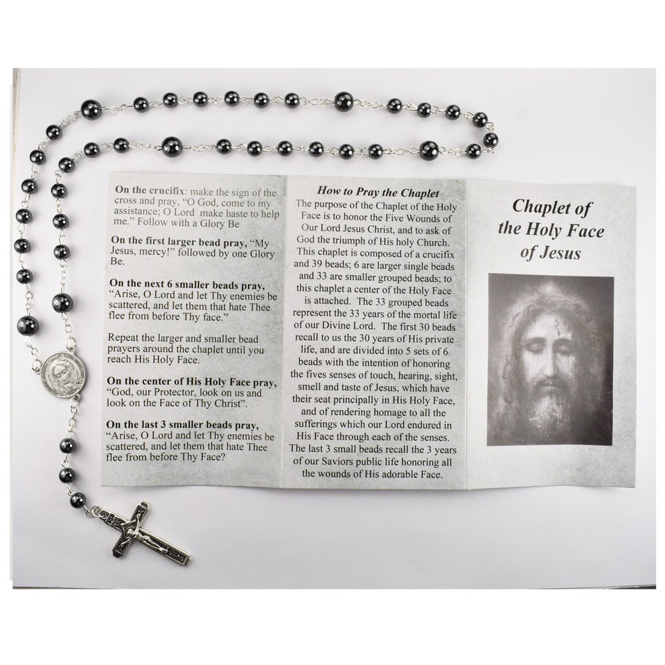 HEMATITE BEADS WITH ZINC COMPONENTS. COMES WITH BOOKLET ON HOW TO PRAY THE CHAPLET AND HANG BAG.