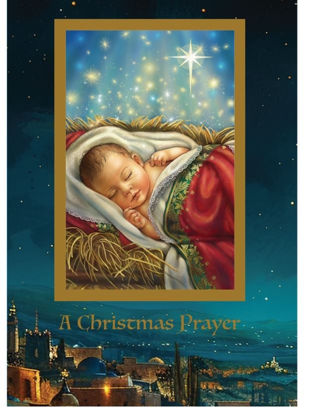 Boxed set of 10 gold foiled A Christmas Prayer Christmas cards with 10 envelopes featuring a removable prayer card. Inside: May the wonder of the first Christmas, the joy of the Father's abundant blessings, and the peace of the Christ Child be with you always. Merry Christmas!