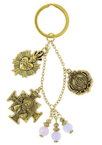 Material:Antique Gold Plate, Aquamarine, Crystal Size:8mm Aquamarine Beads, 5" L, 1" Miraculous Dangle, 1 1/2" Sacred Heart Dangle, 1 1/4" Saint Benedict Dangle
