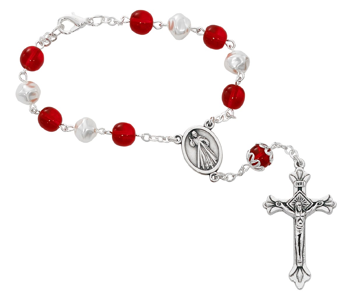 8MM RED AND WHITE PEARL GLASS BEADS WITH SILVER OX CRUCIFIX AND CENTER. COMES CARDED. MADE IN ITALY.