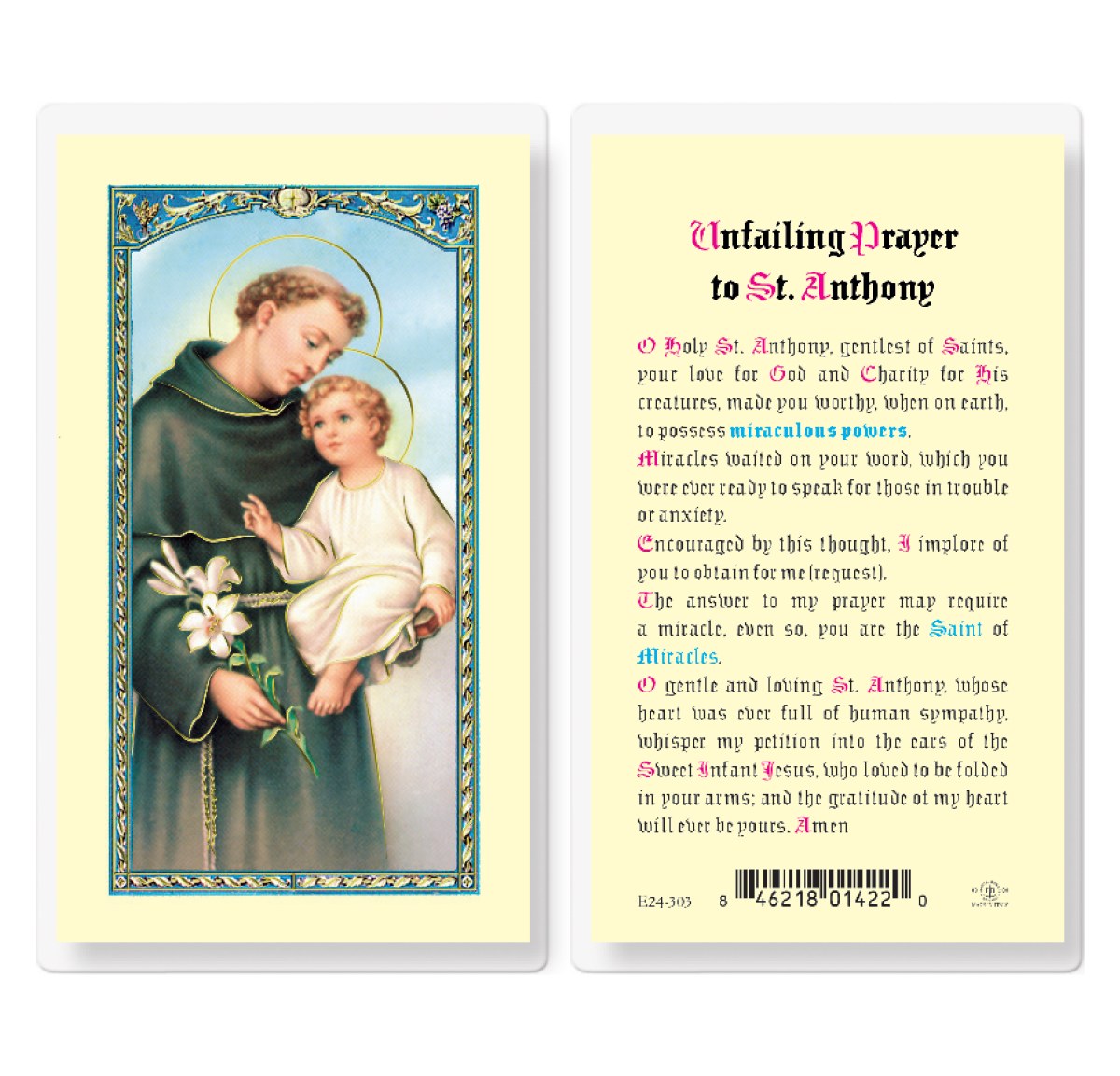 Clear, laminated Italian holy cards with gold accents. Features World Famous Fratelli-Bonella Artwork. 2.5'' X 4.5''