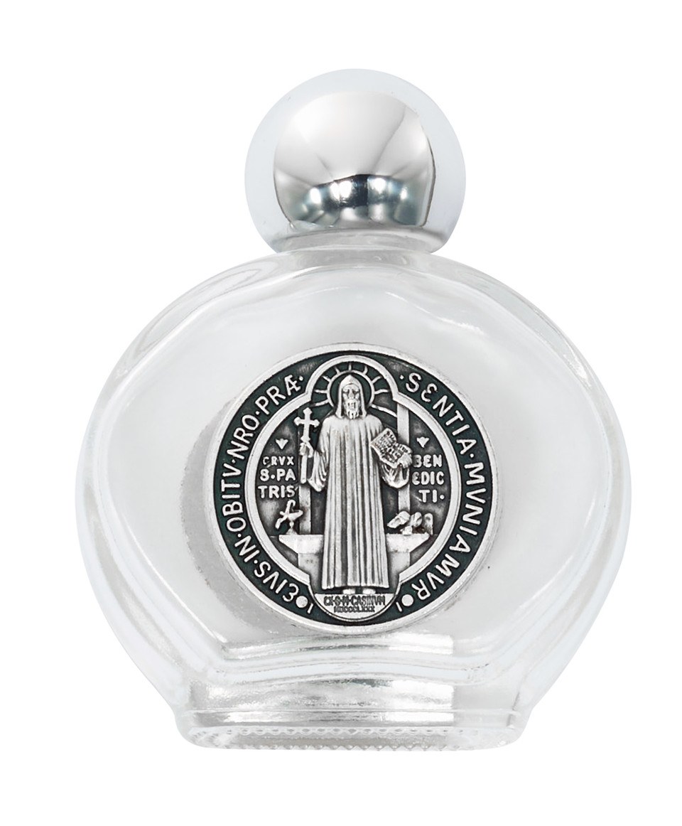 GLASS HOLY WATER BOTTLE WITH SILVER OX ST. BENEDICT COIN IMAGE ON BOTH SIDES. MADE IN ITALY. HOLDS APPROX. 1 OZ WATER. DIMENSION: 2.25" H X 1.5" W X .