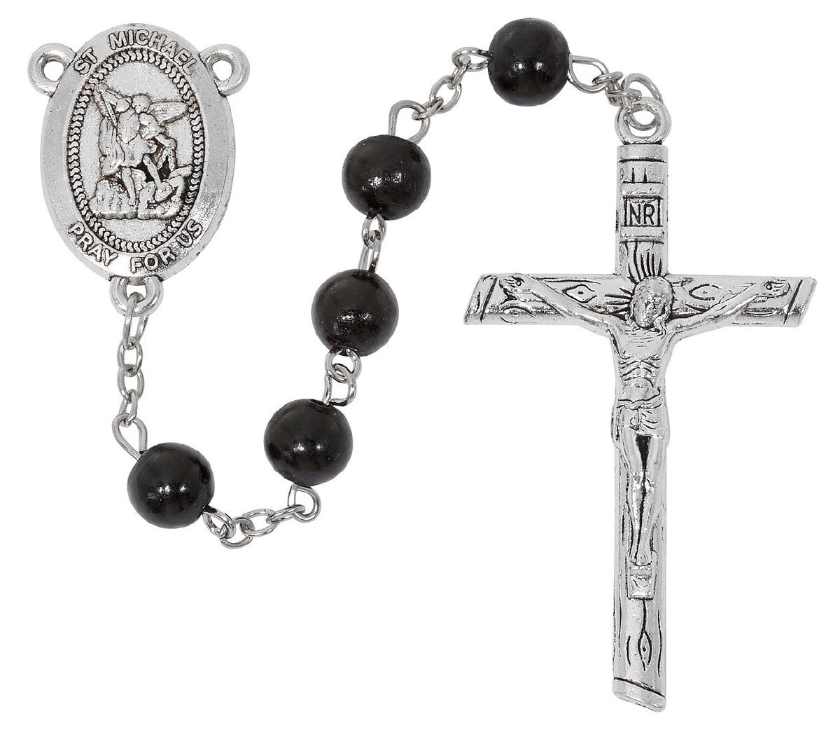 8MM BLACK WOOD BEADS WITH SILVER OX CRUCIFIX AND CENTER. CARDED.